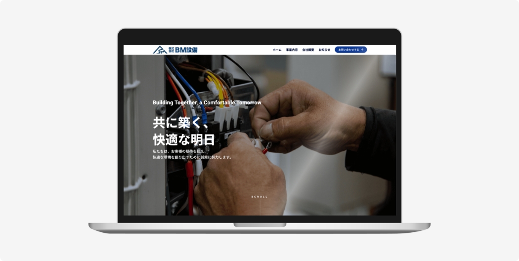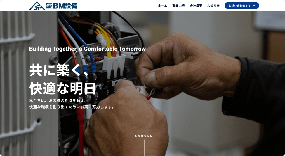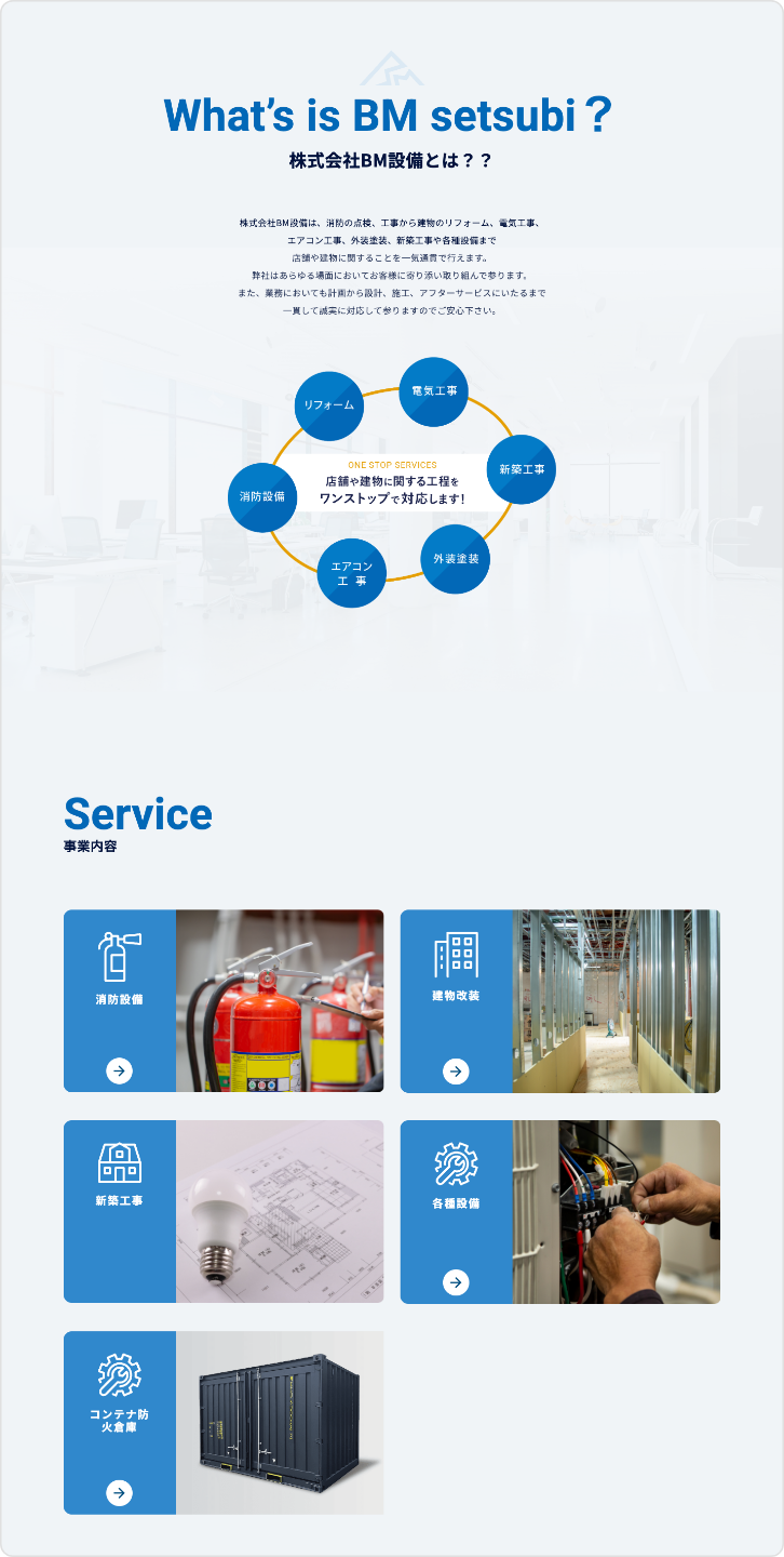 名古屋市を拠点に、消防点検・工事、建物のリフォーム、電気工事、エアコン工事、外装塗装、新築工事、各種設備など一括で対応するトータルサポート企業のコーポレートサイト。豊富な施工事例を掲載し、お客様が具体的なイメージを持てるよう工夫。 ワンストップで対応が可能ということが伝わるよう図を用いたデザインを設計。