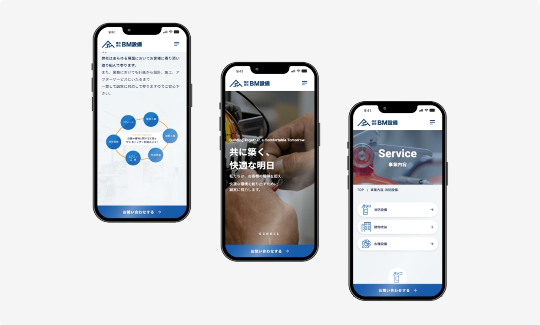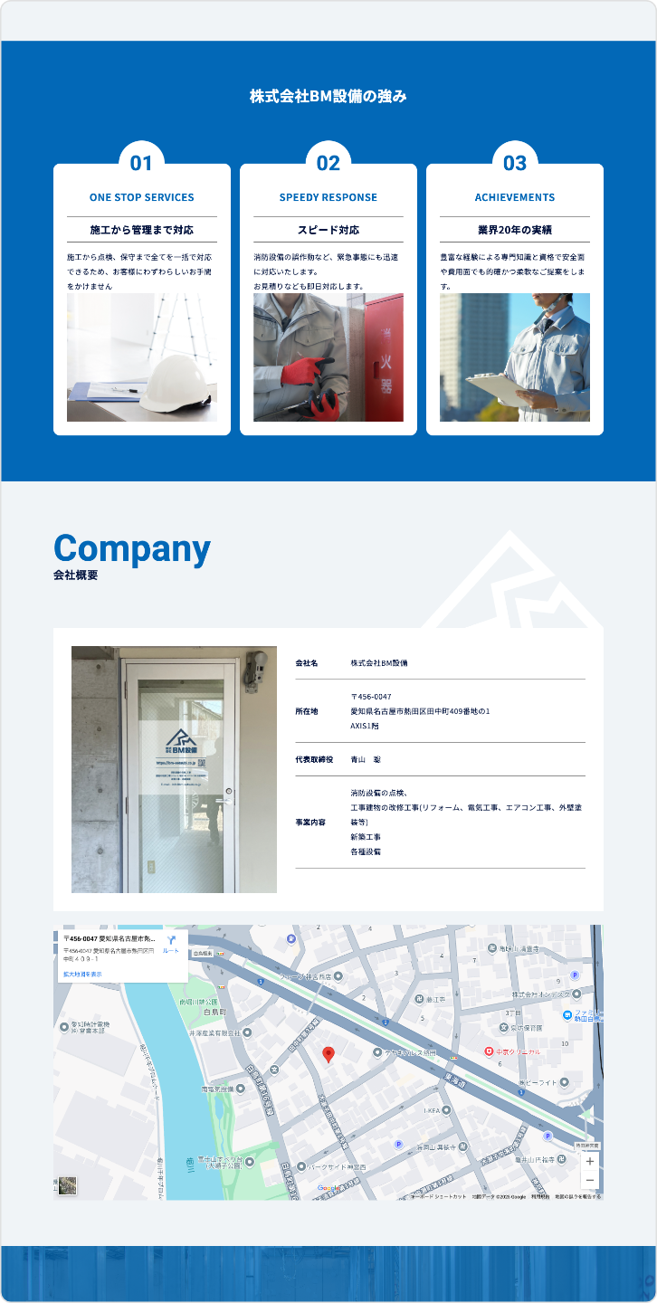 制作コンセプトが入ります制作コンセプトが入ります制作コンセプトが入ります。 テキストダミーテキストダミーテキステキストダミーテキストダミーテキストダミーテキストダミーテキテキストダミーテキストダミ名古屋市を拠点に、消防点検・工事、建物のリフォーム、電気工事、エアコン工事、外装塗装、新築工事、各種設備など一括で対応するトータルサポート企業のコーポレートサイト。豊富な施工事例を掲載し、お客様が具体的なイメージを持てるよう工夫。 ワンストップで対応が可能ということが伝わるよう図を用いたデザインを設計。